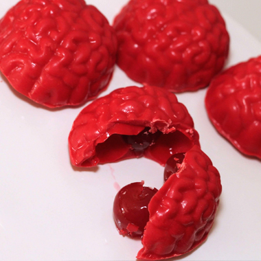 Melt more candy melts and fill the rest of the brain molds over the cherries.